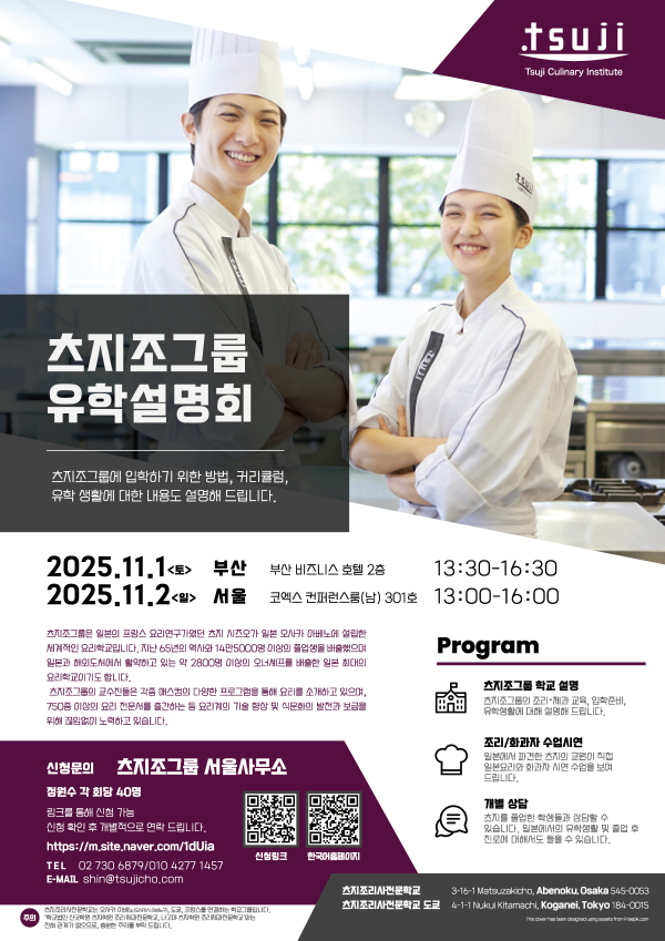 또한, 일본요리와 화과자 시연수업도 동시에 진행되며 '츠지조 그룹' 요리학교를 졸업하고 현장에서 활동중인 선배들과 직접 상담할 수 있는 시간도 마련되어 있으니 관심있는 여러분들의 많은 참여를 부탁 드립니다.